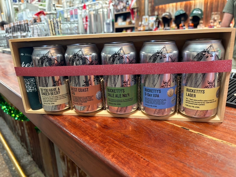 The perfect Chrissy present!! One of each of our core range beers, a Bucketty's stubby cooler, all perfectly presented in a wooden gift box wrapped up with a ribbon!